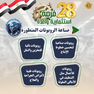 22- صناعة الروبوتات المتطورة (روبوتات صناعية لتحسين خطوط الإنتاج- روبوتات طبية لأغراض الجراحة والعلاج – روبوتات ذكية للتخزين والنقل – روبوتات للأعمال مثل التنظيف في الأماكن الملوثة)