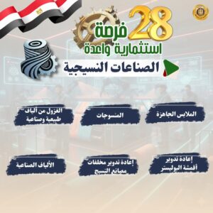 25- الصناعات النسيجية التي تشمل الملابس الجاهزة، والمنسوجات، والغزول من ألياف طبيعية وصناعية، وإعادة تدوير أقمشة البوليستر، وإعادة تدوير مخلفات مصانع النسيج، والألياف الصناعية.