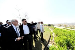 كما تفقدا منطقة التلال والوادى: وتنقسم منطقة التلال إلى ثلاثة تلال متباينة الارتفاعات يمر بينها الممر المائى (النهر)، وتتدرج فى مجموعة من المصاطب تبدأ من حافة النهر وتنتهى حتى قمة التلة بحيث تجعل من قمة التلال مطلات على المشروع والمنطقة المحيطة وقلعة صلاح الدين والأهرامات، وتضم “تلة القصبة” المنشأة على مساحة 13000م2 ( فندقا سياحيا – مباني خدمية – أماكن انتظار سيارات – بحيرة صناعية ) ومدرجات ومناطق جلوس مطلة على الشلال، وكوبرى مشاة للربط، وكافيتريا، وشلال، و”تلة الحفائر” الجاري العمل بها لتصبح المنطقة مزارا أثريا سياحيا ثقافيا متكاملا من خلال الكشف عن بقايا مدينة الفسطاط على مساحة حوالي 47 فدانا للوصول للتكوين المعماري للمدينة الأثرية وترميمها، مع إنشاء ممشى بطول 1كم بارتفاع 1,5 م عن منطقة الحفائر حول مدينة الفسطاط الأثرية ( الحفائر ) لربط المباني الخدمية السياحية بالموقع العام لاستثمار المنطقة التراثية كمنطقة سياحية ذات طابع متميز، فيما تضم “تلة الحدائق التراثية” مدرجات ومبانى للزوار ومطاعم وفراغا خشبيا يطل على البحيرة مستعرضاً المخططات التفصيلية لتلك التلال وما تحويه من مسارات وحدائق متنوعة، ومناطق للمطاعم والاحتفالات والترفيه.
