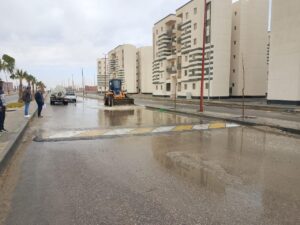 وفي مدينة السويس الجديدة، تمت متابعة أعمال سحب وشفط مياه الأمطار ميدانياً، والتأكد من كفاءة شبكات التصريف وانتظام عملها، مع الدفع بفرق العمل والمعدات إلى المناطق الحيوية، ومنها الطريق الساحلي والحي الصناعي والمنطقة الحرة، للتعامل الفوري مع تجمعات المياه.