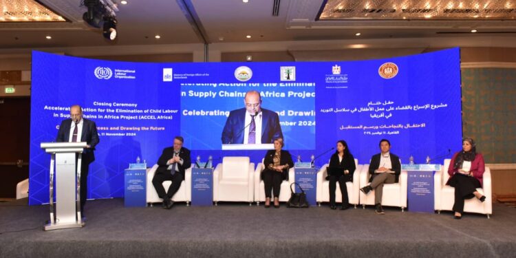 في كلمته، أكد السيد إيريك أوشلان مدير مكتب منظمة العمل الدولية بالقاهرة على أنه”من خلال مشروع ACCEL Africa تم تنفيذ أنشطة متعددة وشاملة لمعالجة الأسباب الجذرية لعمل الأطفال. ومع نهاية المشروع، نلتزم بالاستمرار في الحفاظ على التقدم الذي حققناه وتوسيعه، حيث تتضمن استراتيجية الخروج من المشروع توصيات محددة وقابلة للتنفيذ، بما في ذلك تعزيز نظام مراقبة عمل الأطفال وتوجيه الجهود نحو الصناعات وسلاسل التوريد والمناطق الجغرافية التي تنتشر فيها ظاهرة عمل الأطفال، كما تم تحديدها في المسح الوطني لعمل الأطفال لعام 2023..